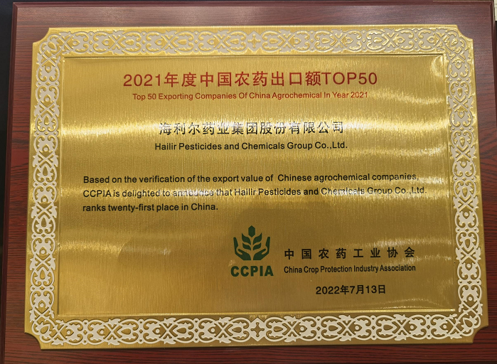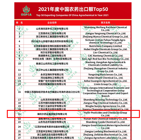 7月13日,在湖南常德举行的第九届中国植物保护产品国际贸易发展论坛暨国际贸易委员会工作年会上,中国农药工业协会国际贸易委员会发布了2021年度中国农药出口额TOP50榜单,betway必威位居榜单第21位。