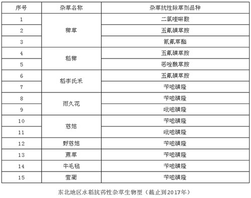 东北地区粳米产量占全国粳米总产量的54.3%,稻田主要杂草有稻稗、无芒稗、长芒稗、杂草稻、江稗、李氏禾、野慈姑、雨久花、狼把草、羽叶鬼针草、扁杆?草、萤蔺、花蔺、异型莎草、碎米莎草、水绵等。